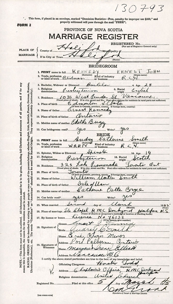 26. Place of marriage H.M.C Dockyard Chapel Halifax, Halifax County
