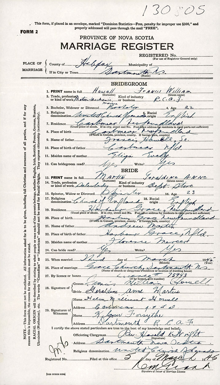26. Place of marriage Grace Church Dartmouth, Halifax County
