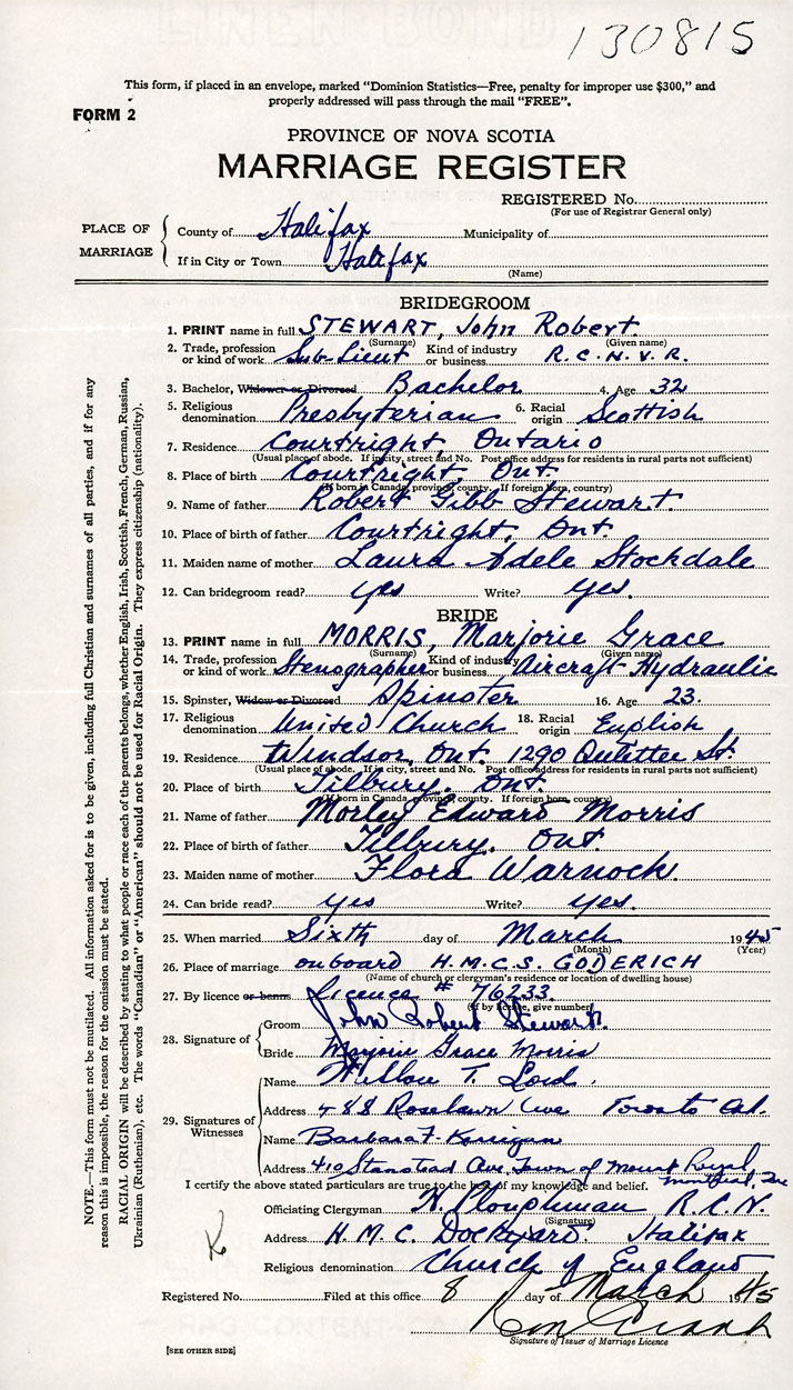 26. Place of marriage onboard, H.M.C.S. Goderich Halifax, Halifax County