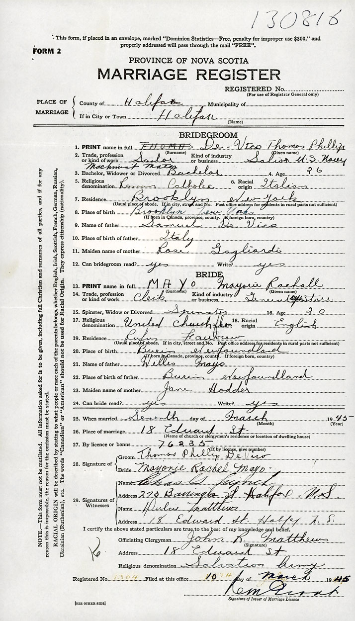 26. Place of marriage 18 Edvard Street Halifax, Halifax County