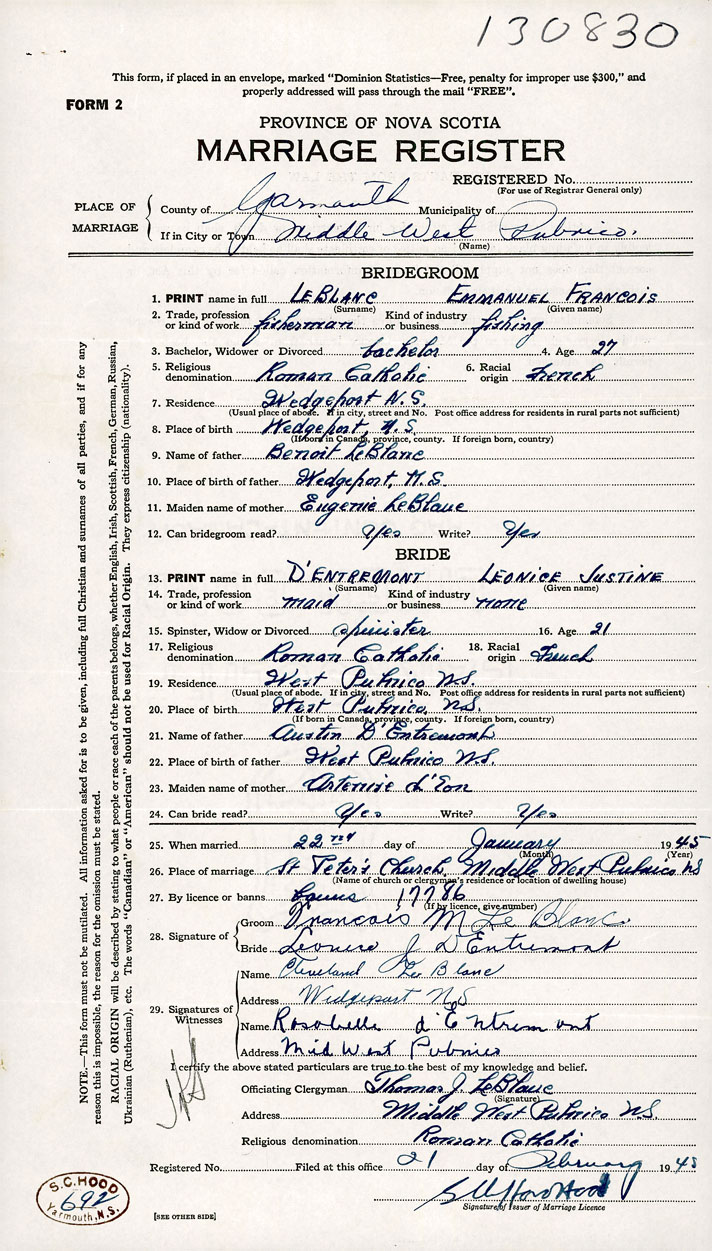 PLACE OF MARRIAGE County of Yarmouth in City or Town Middle West Pubnico