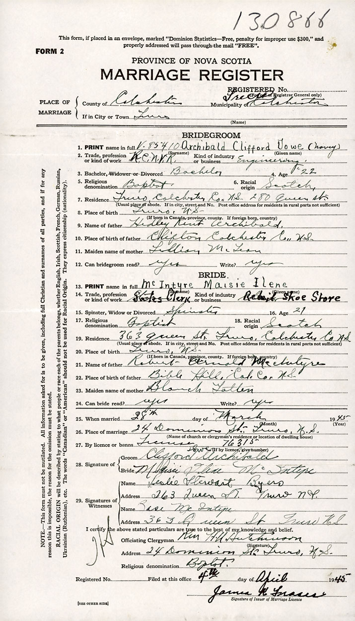 26. Place of marriage 24 Dominion St. Truro, Colchester County