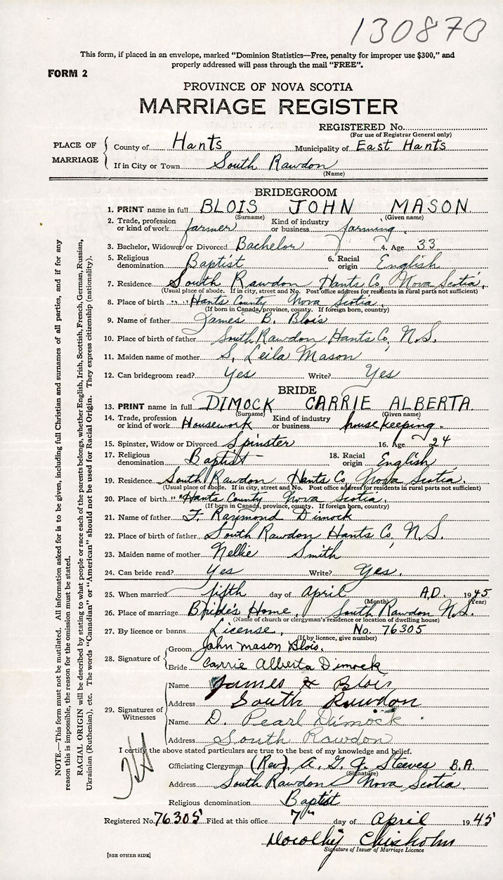26. Place of marriage Bride's home South Rawdon , Hants County
