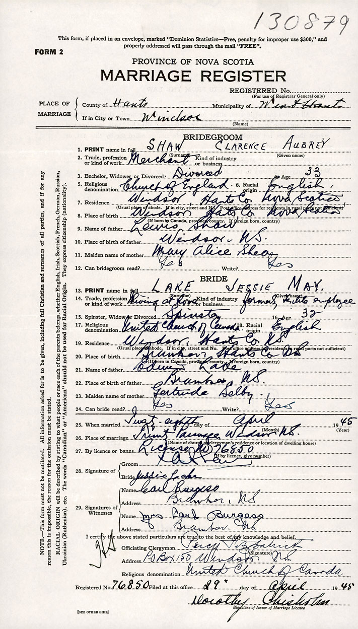 PLACE OF MARRIAGE County of Hants in City or Town Windsor