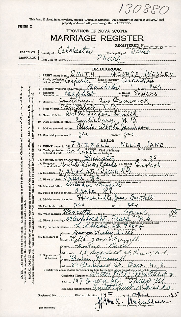26. Place of marriage 30 Archibald St. Truro, Colchester County