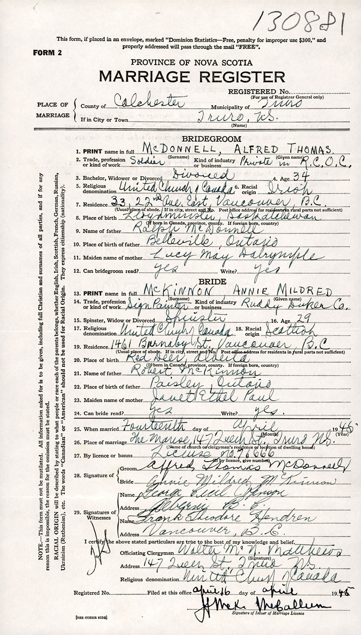 26. Place of marriage The Manse, 147 Queen St. Truro, Colchester County