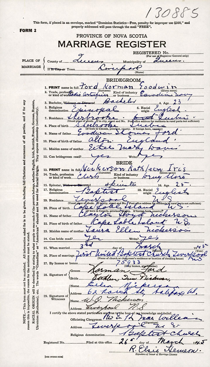26. Place of marriage First United Baptist Church Liverpool, Queens County