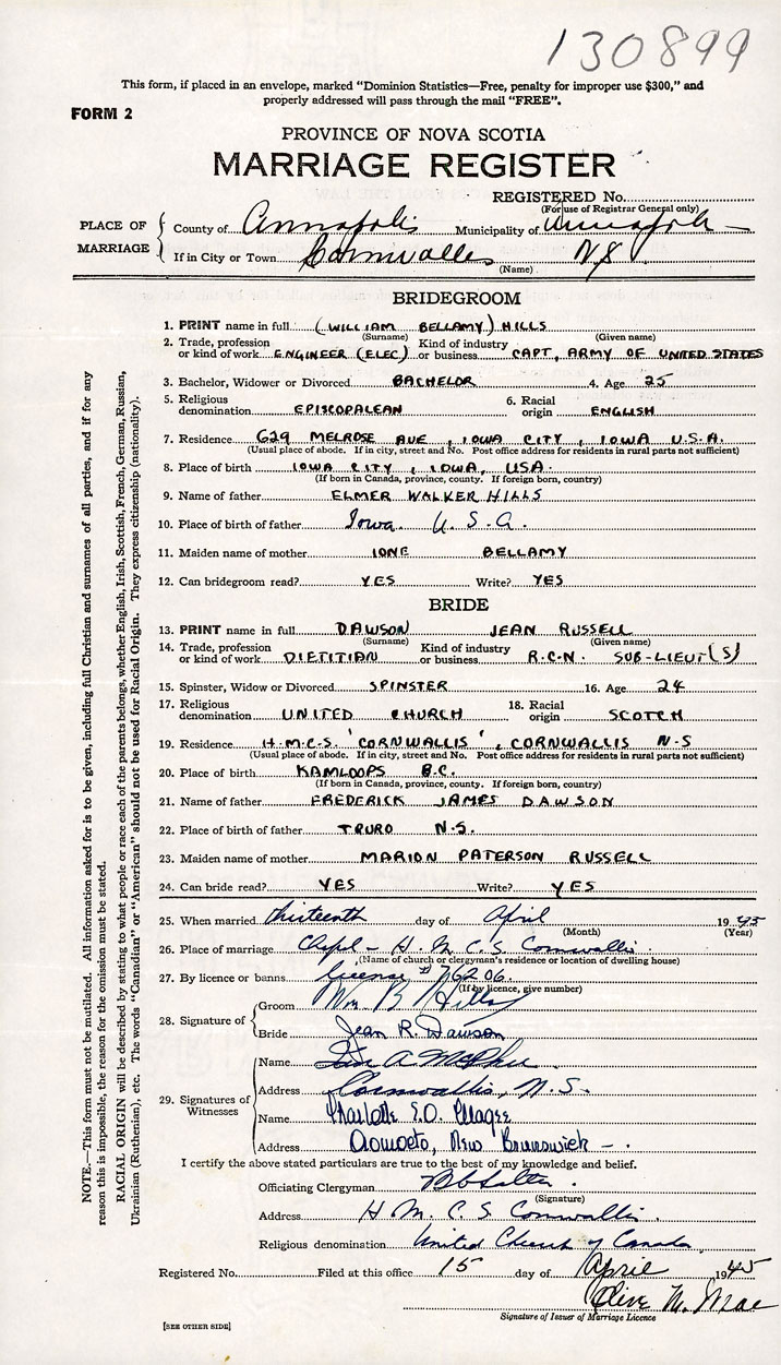 26. Place of marriage Chapel HMCS Cornwallis Cornwallis, Annapolis County