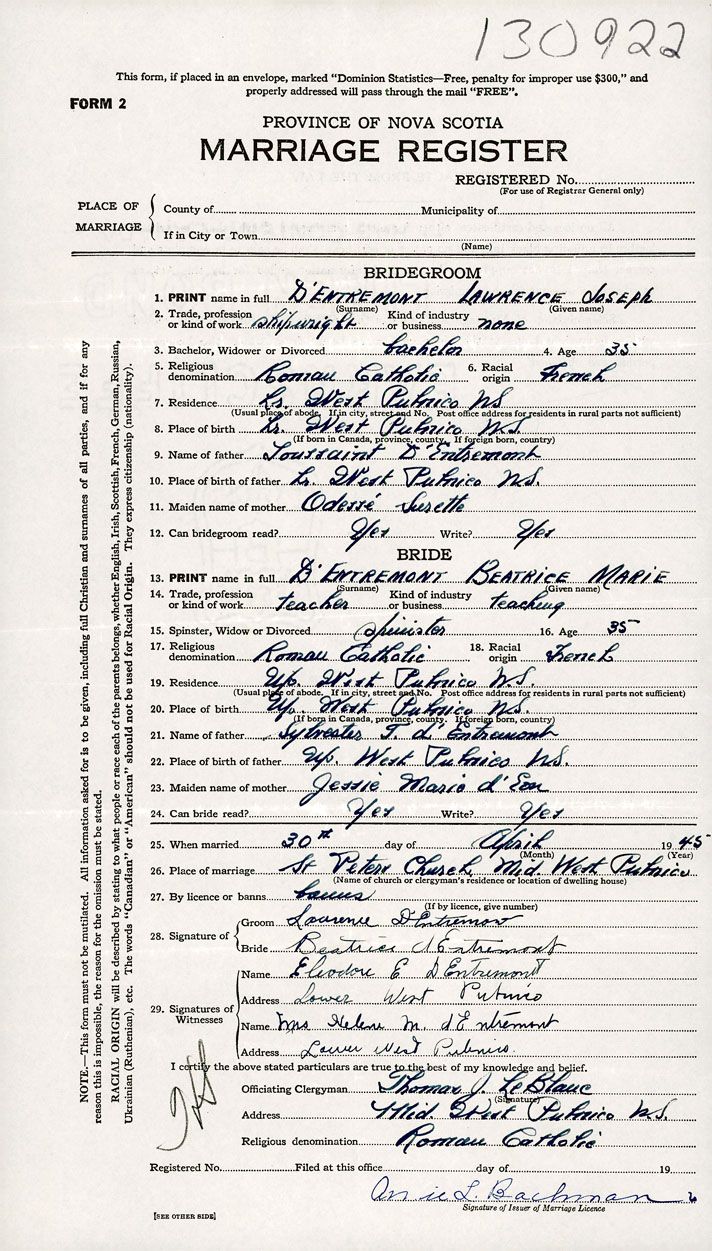 13. PRINT name in full D'Entremont, Beatrice Marie