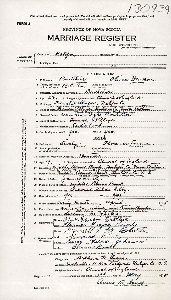 PLACE OF MARRIAGE County of Halifax in City or Town Beaver Bank