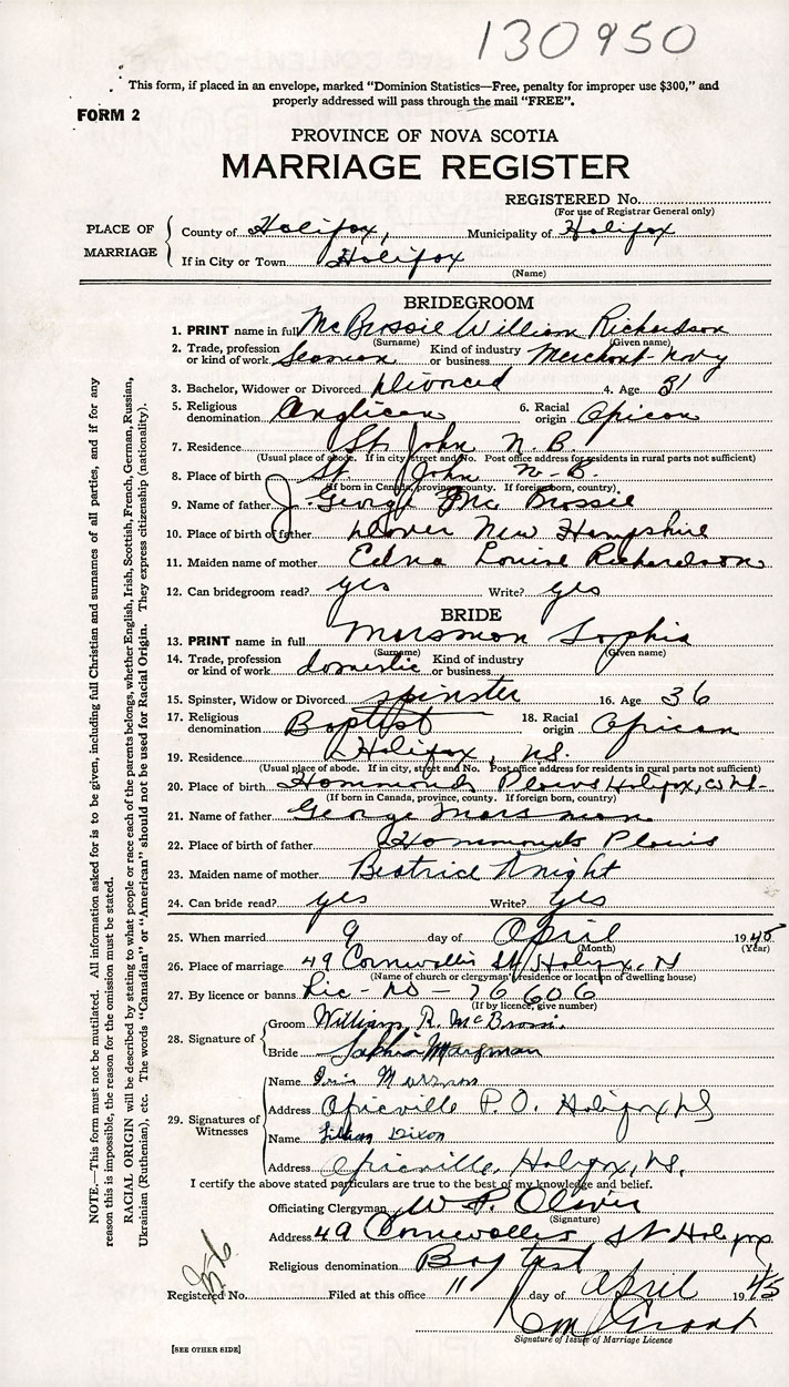 26. Place of marriage 49 Cornwallis Street Halifax, Halifax County