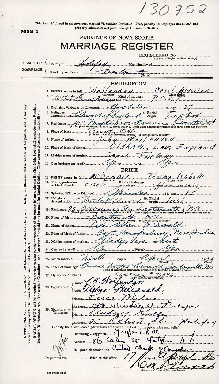 26. Place of marriage Grace United Church Dartmouth, Halifax County
