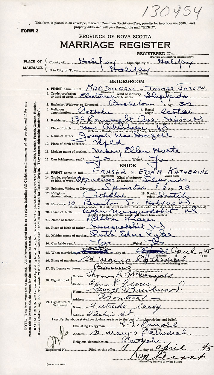 26. Place of marriage St. Mary's Cathedral Halifax, Halifax County