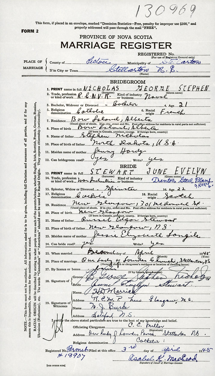 26. Place of marriage Our Lady of Lourdes Church Stellarton, Pictou County