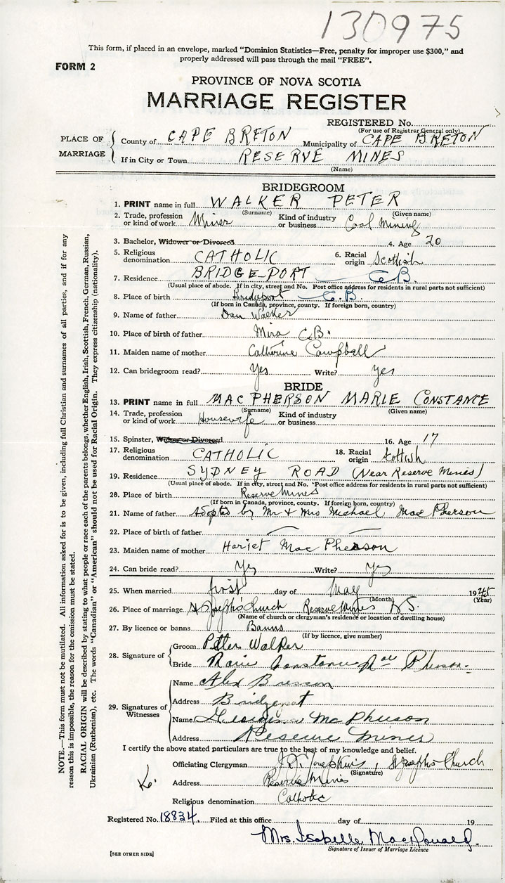 PLACE OF MARRIAGE County of Cape Breton in City or Town Reserve Mines
