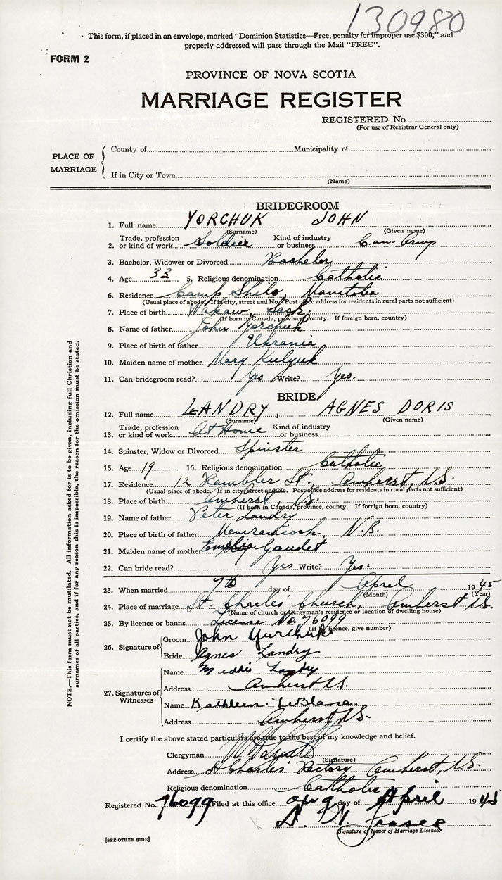 26. Place of marriage St. Charles' Church Amherst, Cumberland County
