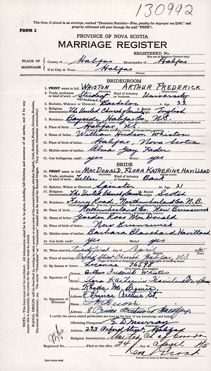 26. Place of marriage Oxford Street Church Halifax, Halifax County