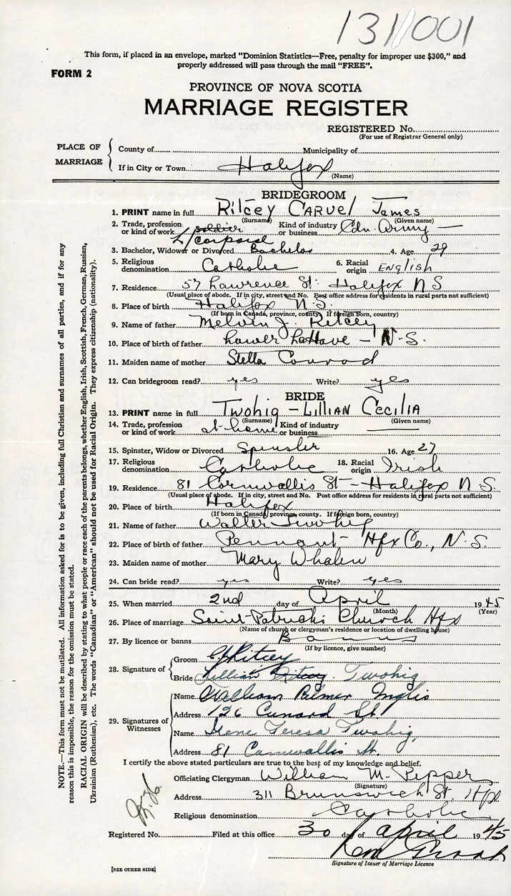 26. Place of marriage Saint Patrick's Church Halifax, Halifax County