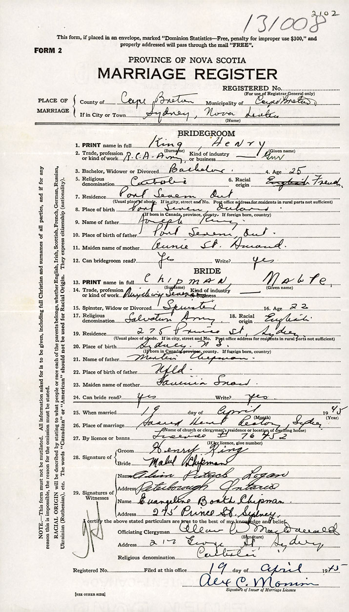 26. Place of marriage Sacred Heart Rectory Sydney, Cape Breton County