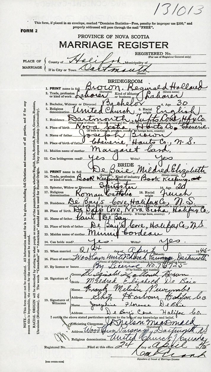 26. Place of marriage Woodlawn United Church Parsonage Dartmouth, Halifax County