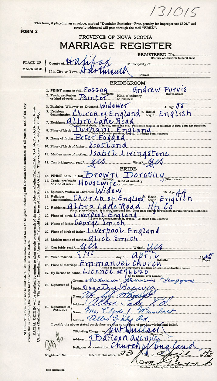 26. Place of marriage Emmanuel Church Dartmouth, Halifax County