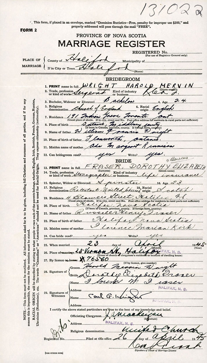 26. Place of marriage 25 Vernon Street Halifax, Halifax County