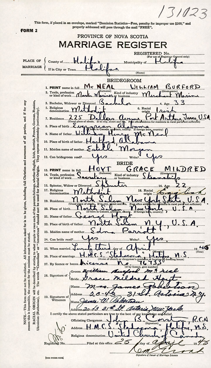 26. Place of marriage HMCS "Stadacona" Halifax, Halifax County