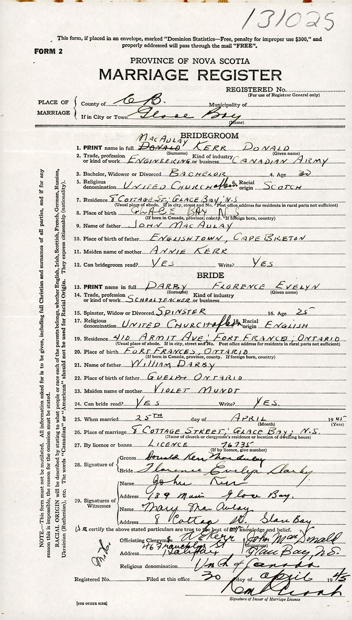 26. Place of marriage 8 Cottage Street Glace Bay, Cape Breton County