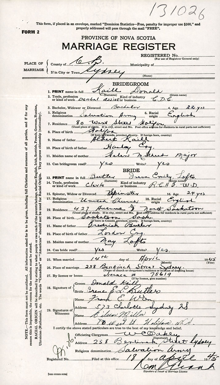 26. Place of marriage 258 Bentinck Street Sydney, Cape Breton County