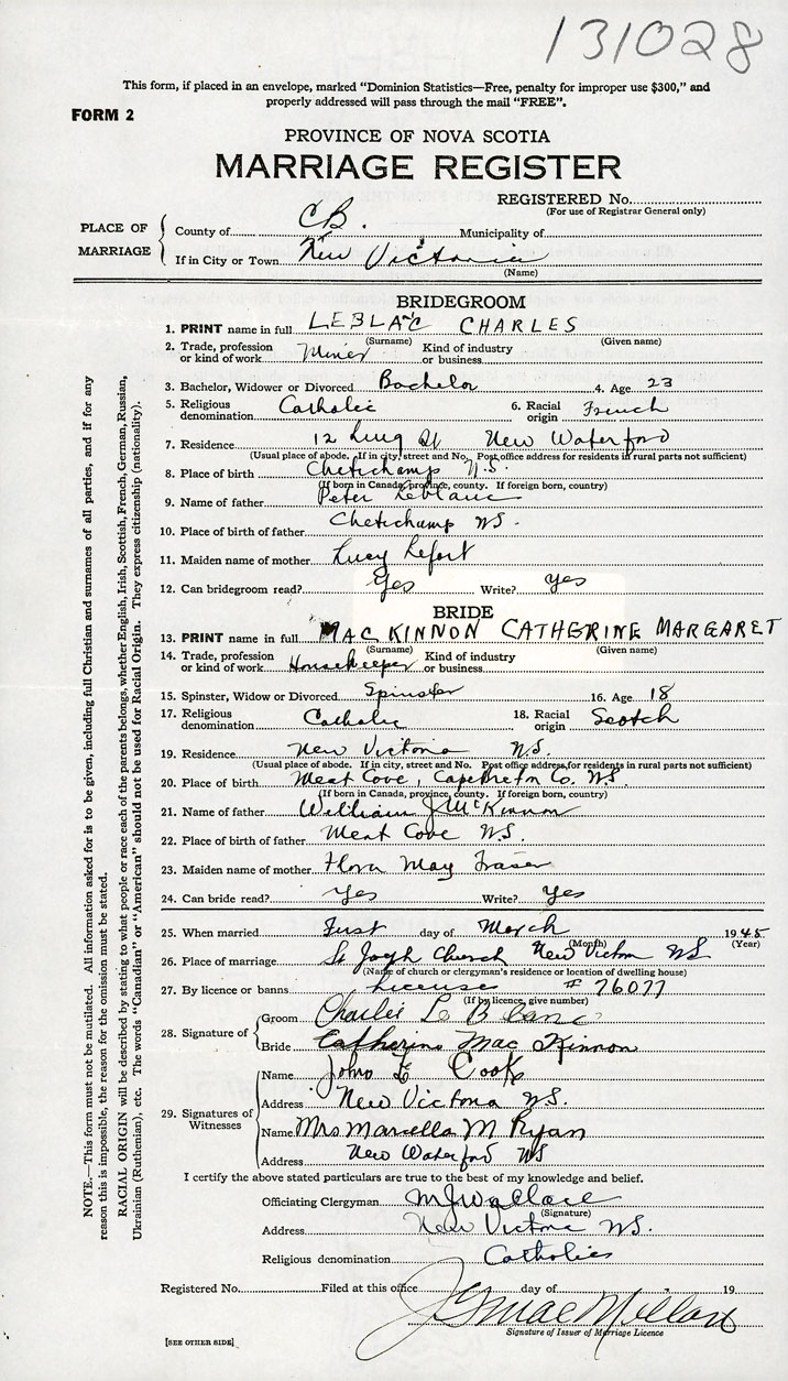 PLACE OF MARRIAGE County of Cape Breton in City or Town New Victoria