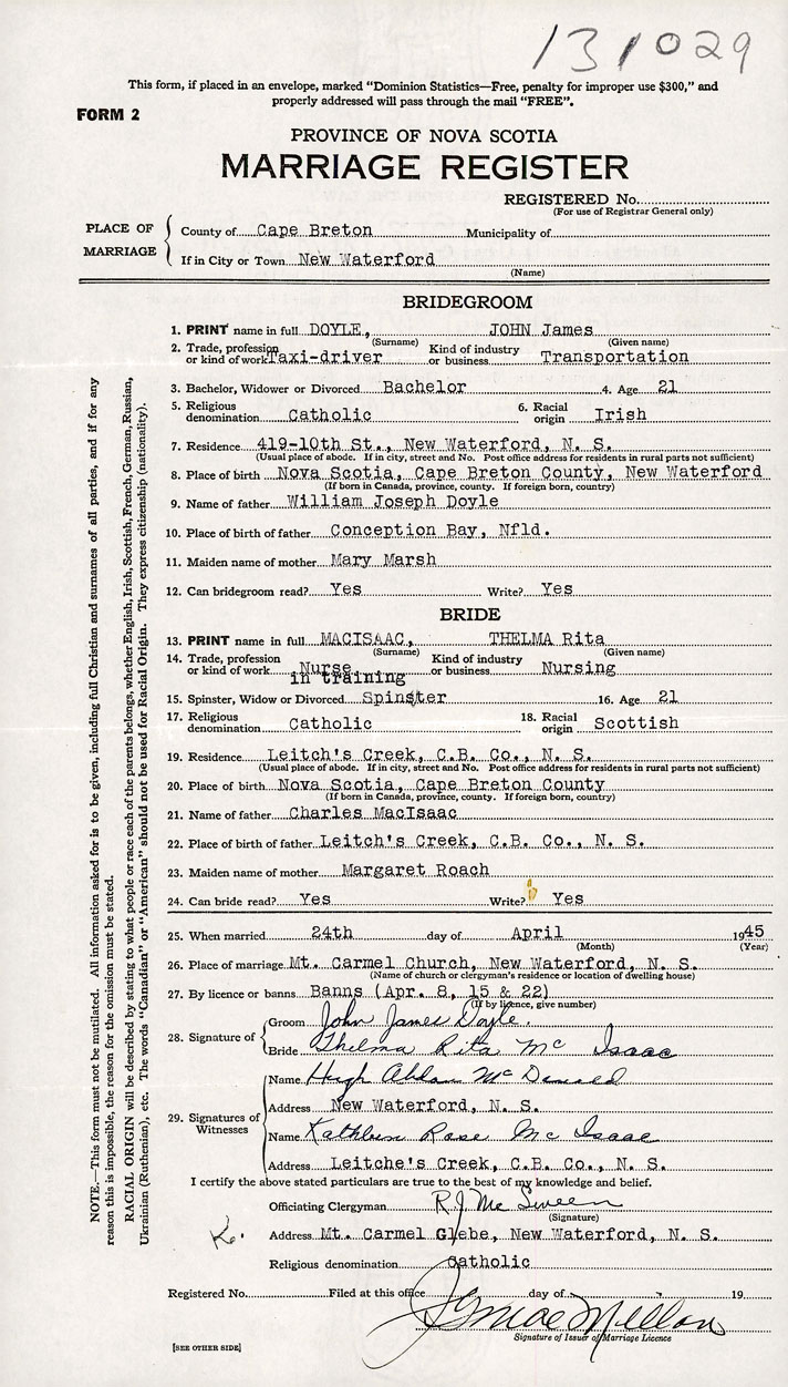 26. Place of marriage Mt Carmel Church New Waterford, Cape Breton County