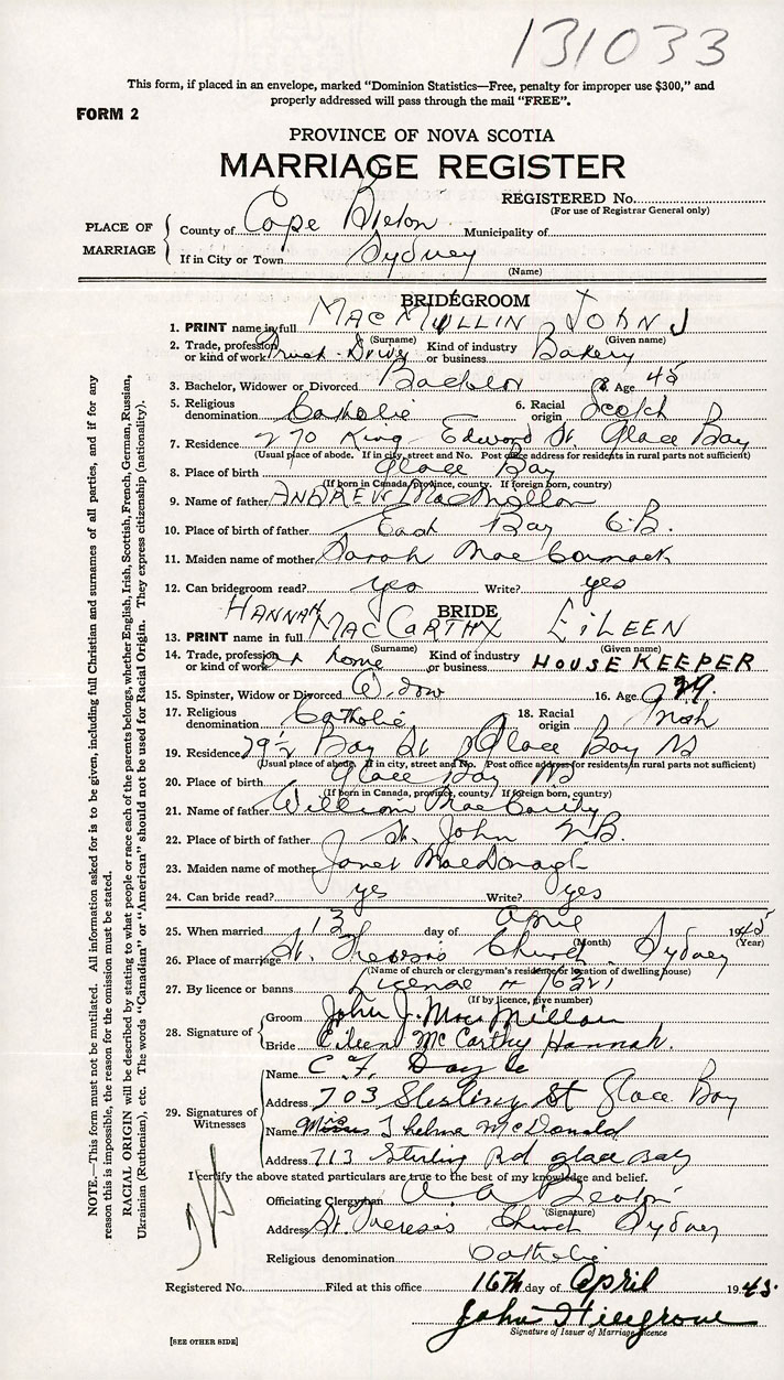 26. Place of marriage St. Theresa's Church Sydney, Cape Breton County
