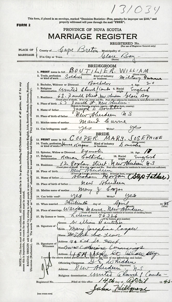 PLACE OF MARRIAGE County of Cape Breton in City or Town New Aberdeen
