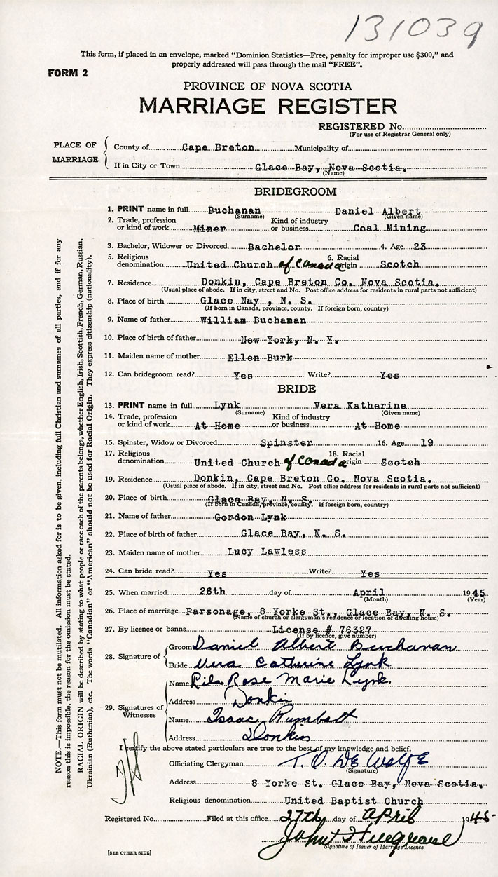 26. Place of marriage Parsonage, 8 Yorke St. Glace Bay, Cape Breton County