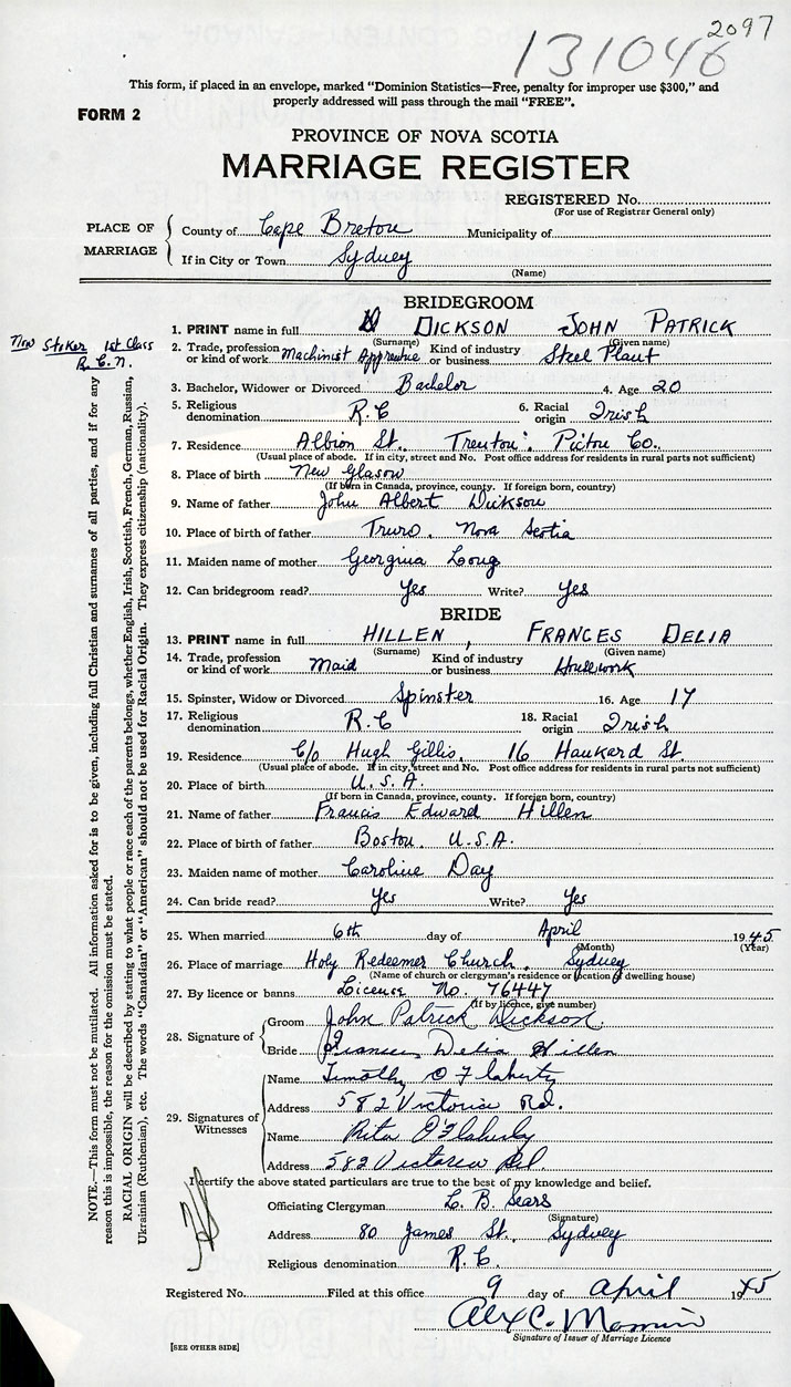 PLACE OF MARRIAGE County of Cape Breton in City or Town Sydney