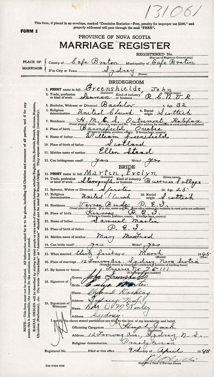 26. Place of marriage 12 Fenway Ave., Sydney, Cape Breton County