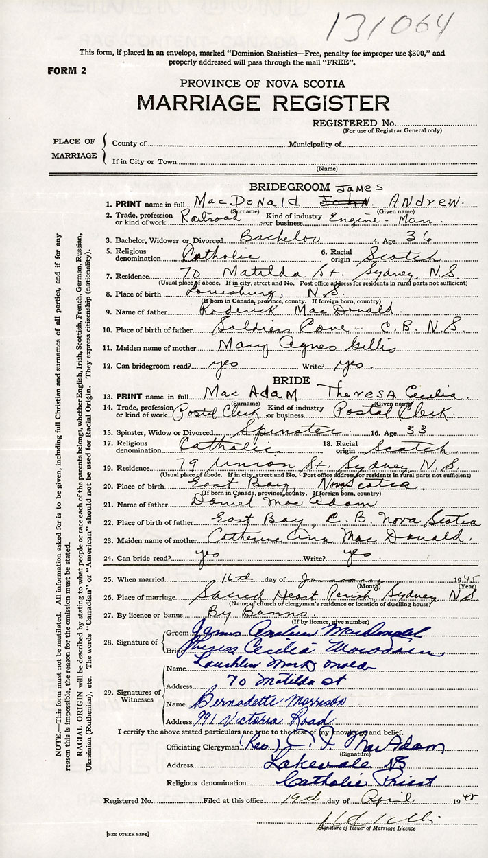PLACE OF MARRIAGE County of Cape Breton in City or Town Sydney