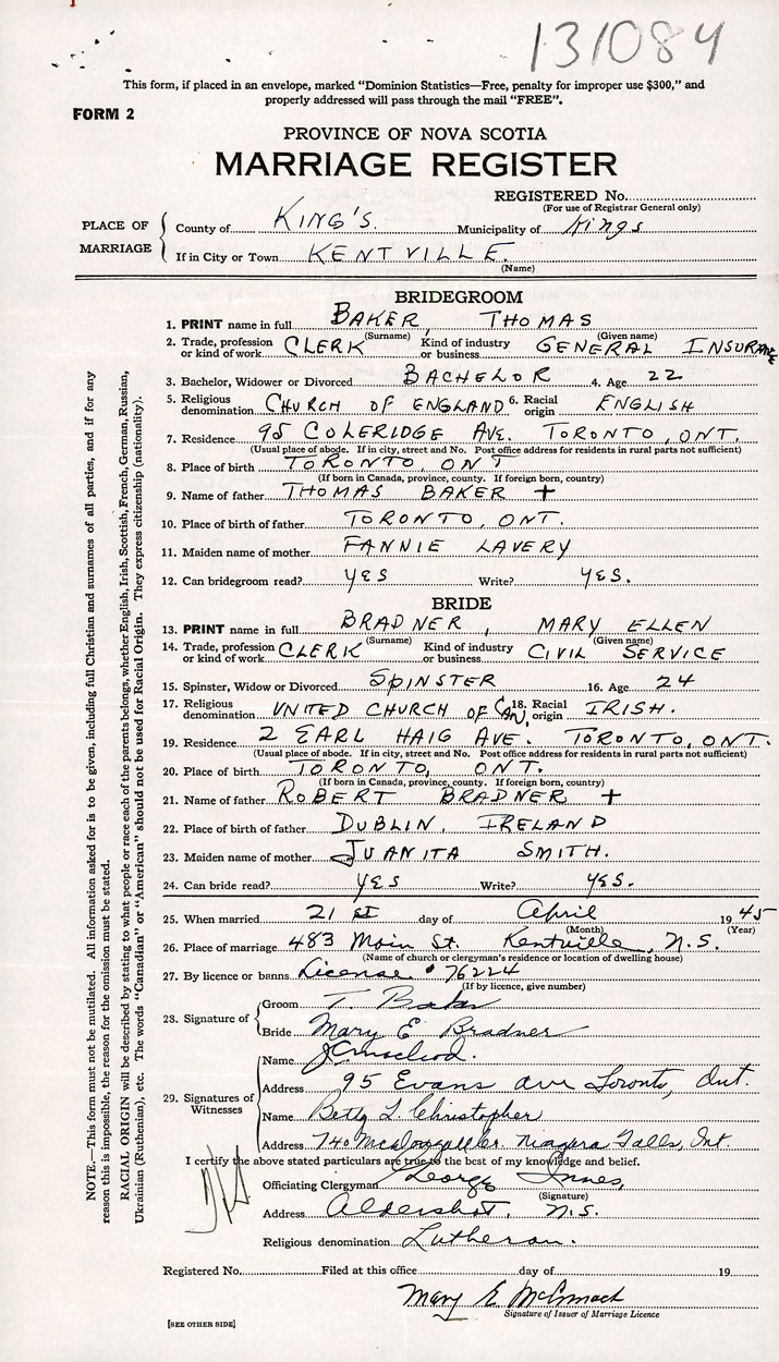 26. Place of marriage 483 Main Street Kentville, Kings County