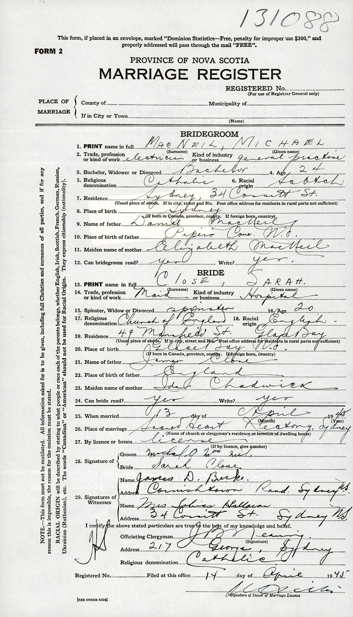 26. Place of marriage Sacred Heart Rectory Sydney, Cape Breton County