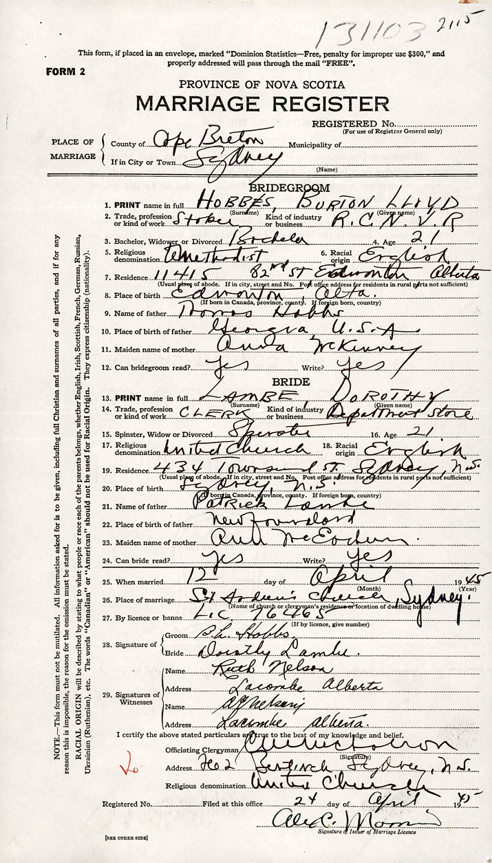 26. Place of marriage St Andrews Church Sydney, Cape Breton County