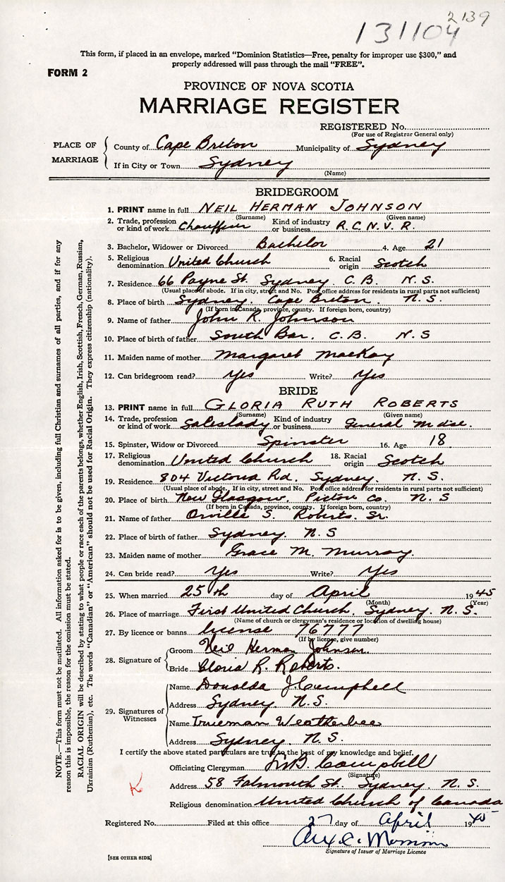 26. Place of marriage First United Church Sydney, Cape Breton County