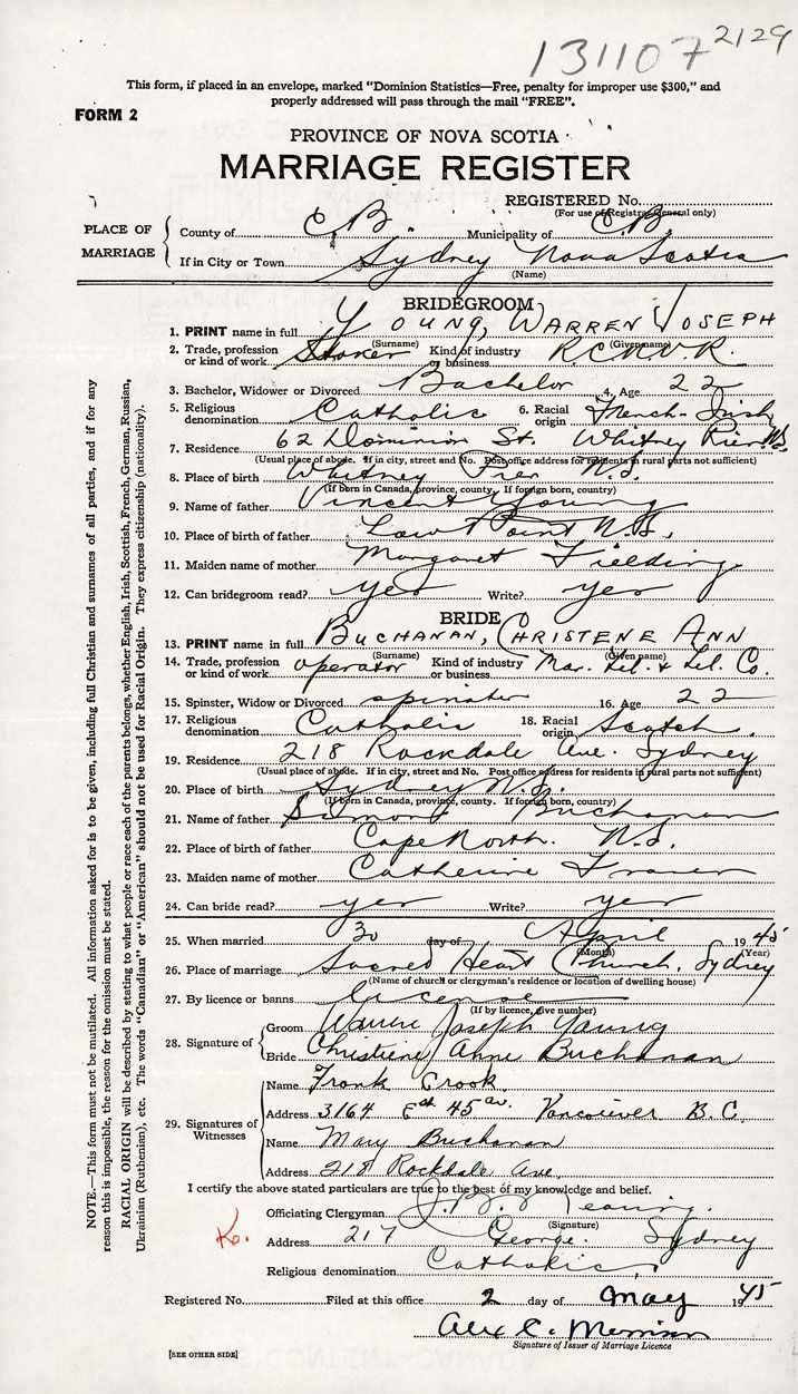 26. Place of marriage Sacred Heart Church Sydney, Cape Breton County