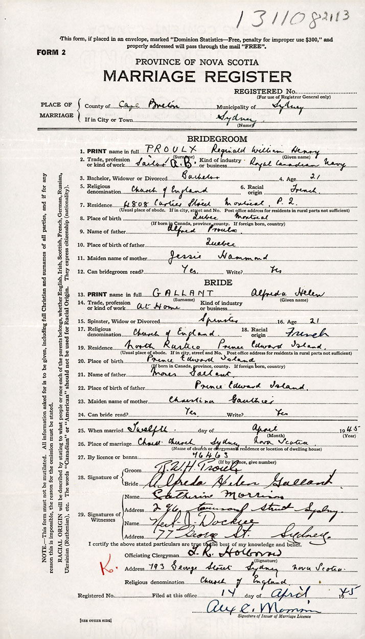 PLACE OF MARRIAGE County of Cape Breton in City or Town Sydney