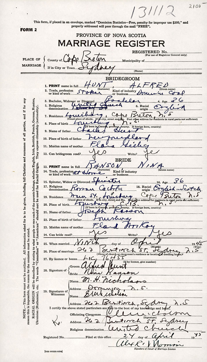 26. Place of marriage 262 Bentick St., Sydney, , Cape Breton County