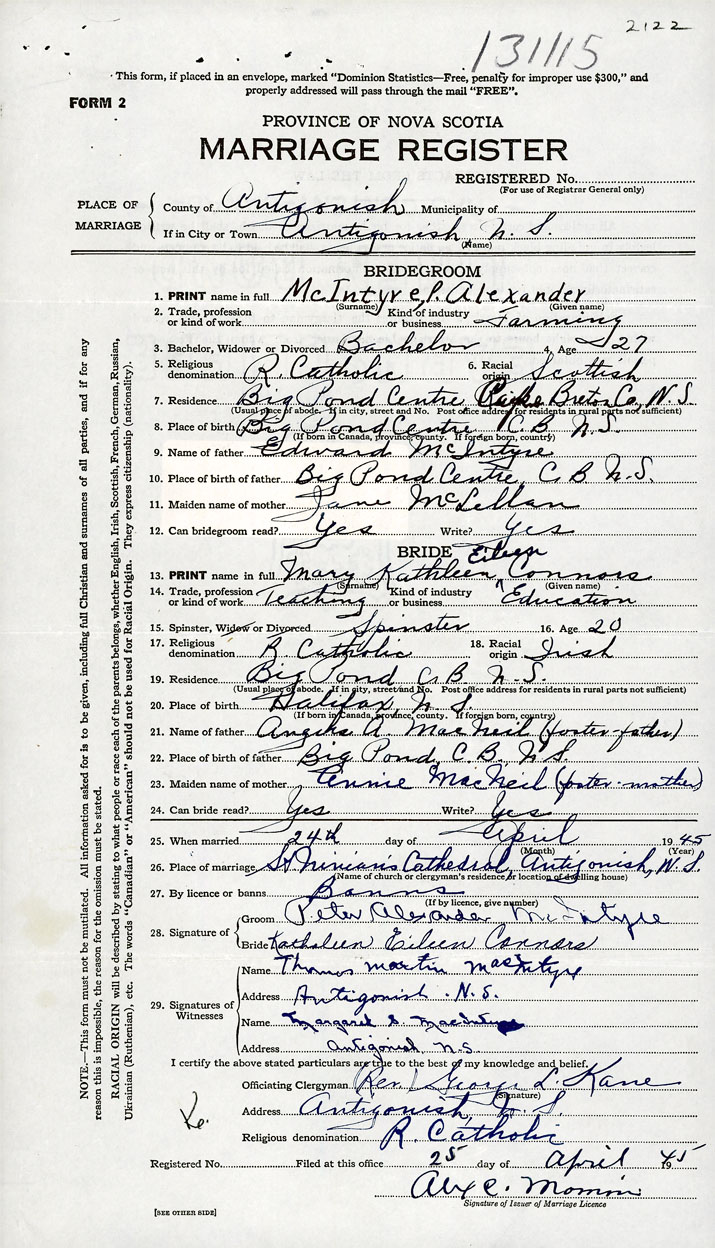 PLACE OF MARRIAGE County of Antigonish in City or Town Antigonish
