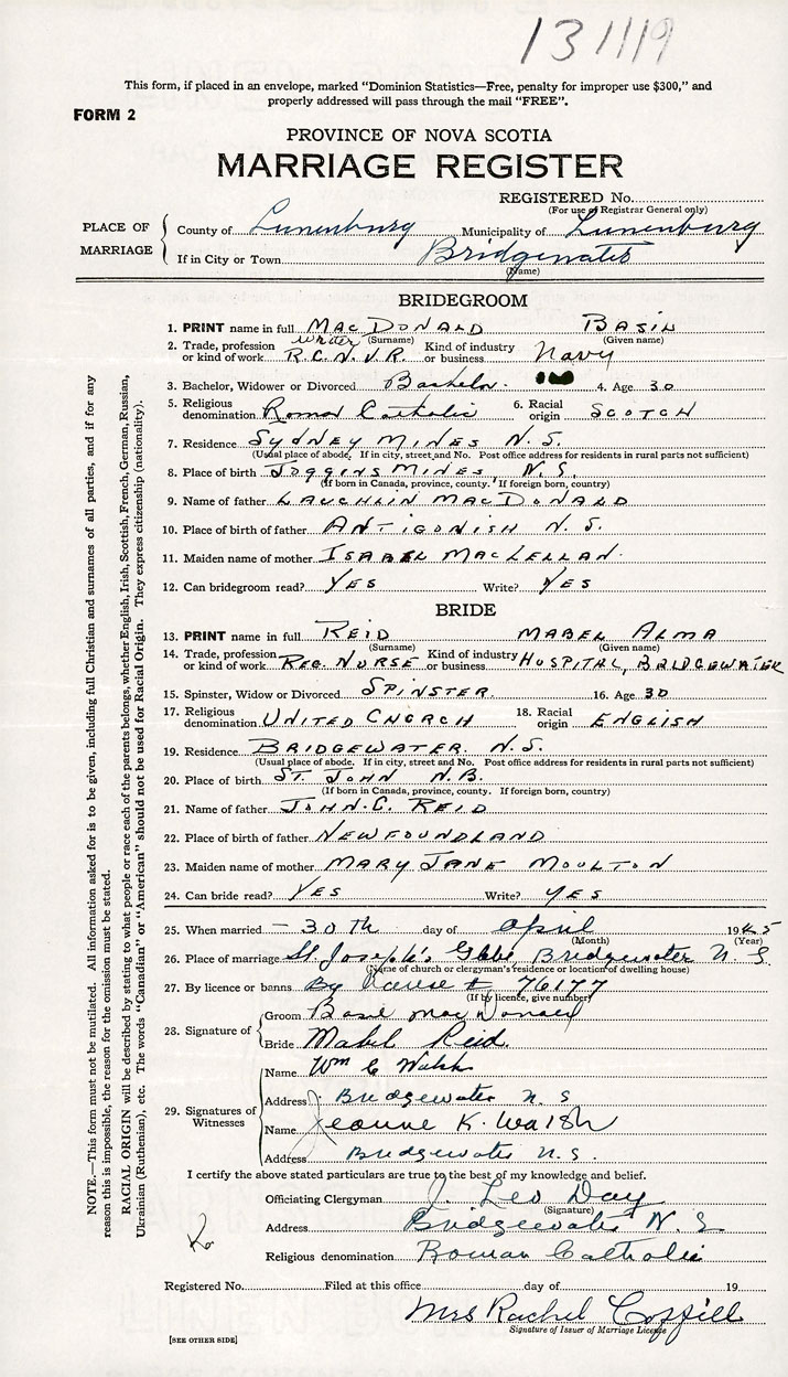 PLACE OF MARRIAGE County of Lunenburg in City or Town Bridgewater