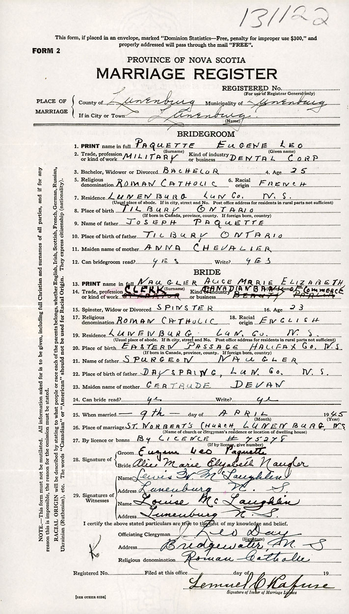 26. Place of marriage St. Norbert's Church Lunenburg, Lunenburg County