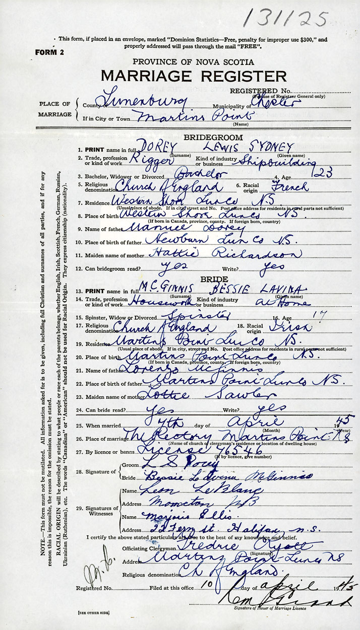 PLACE OF MARRIAGE County of Lunenburg in City or Town Martins Point