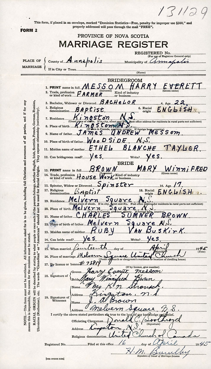 26. Place of marriage Melvern Square United Church Melvern Square, Annapolis County