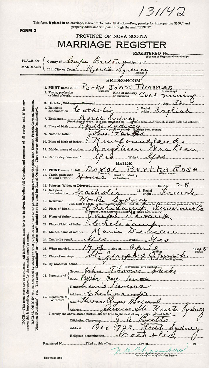 26. Place of marriage St. Joseph's Church North Sydney, Cape Breton County